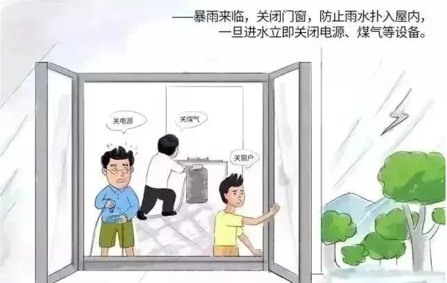 汛情來臨時,及時關閉門窗,防止雷電直擊室內。同時,注意不要把花盆等物件放在窗外位置(容易掉落);